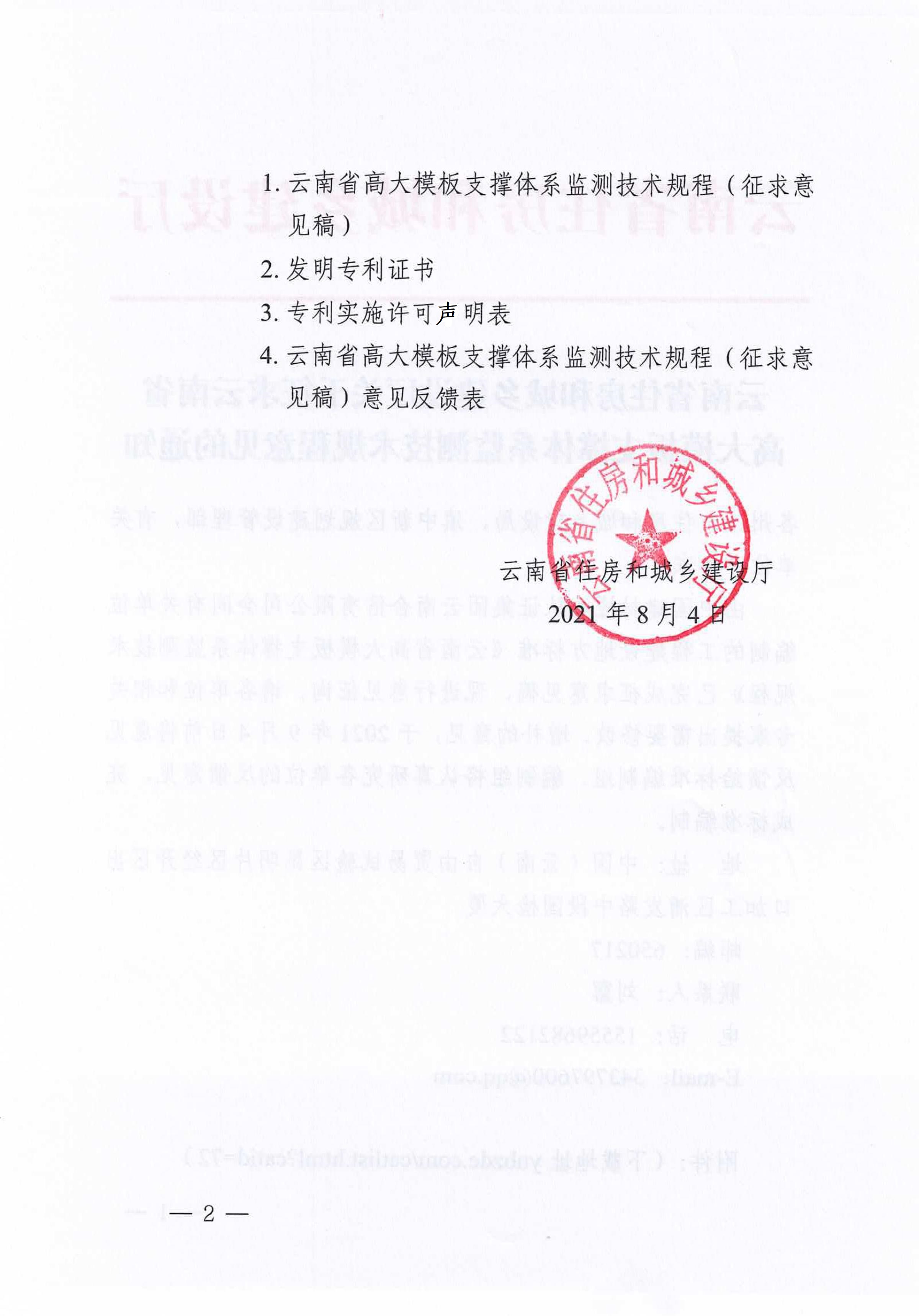 云南省住房和城鄉建設廳關于征求云南省高大模板支撐體系監測技術規程意見的通知